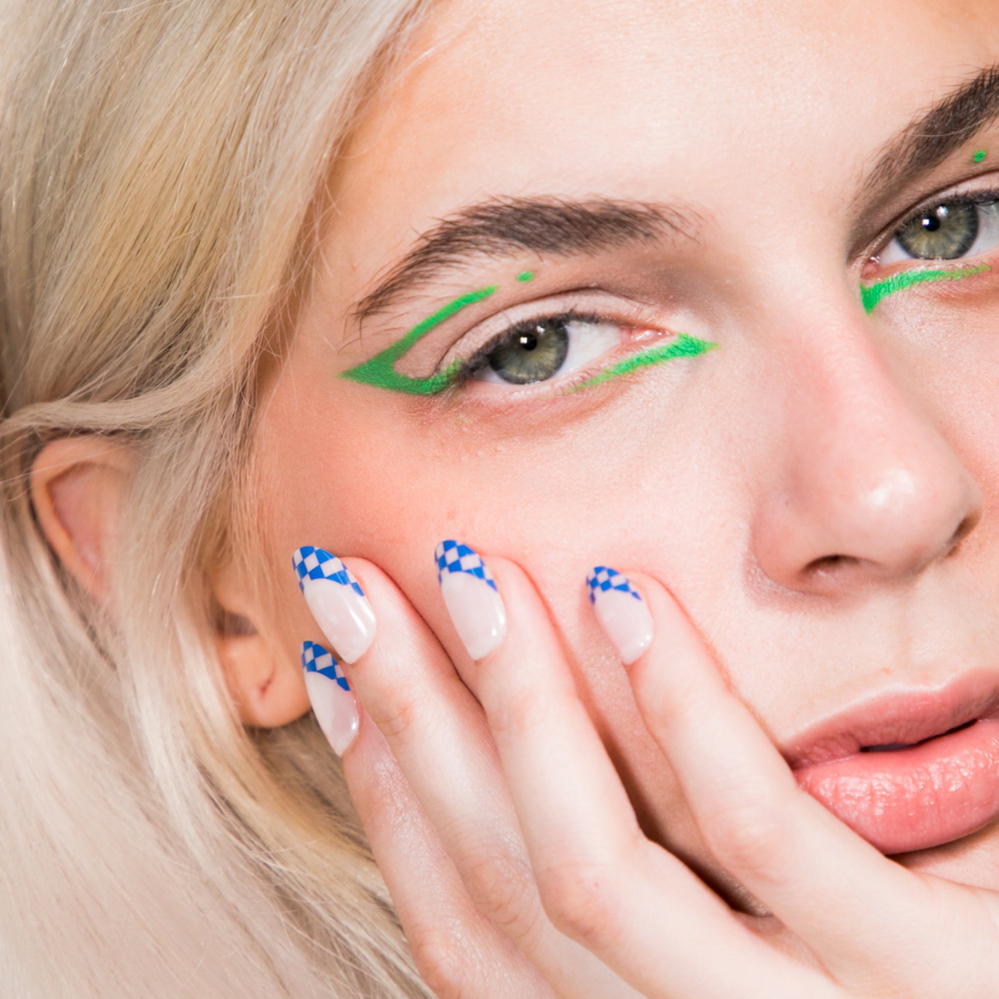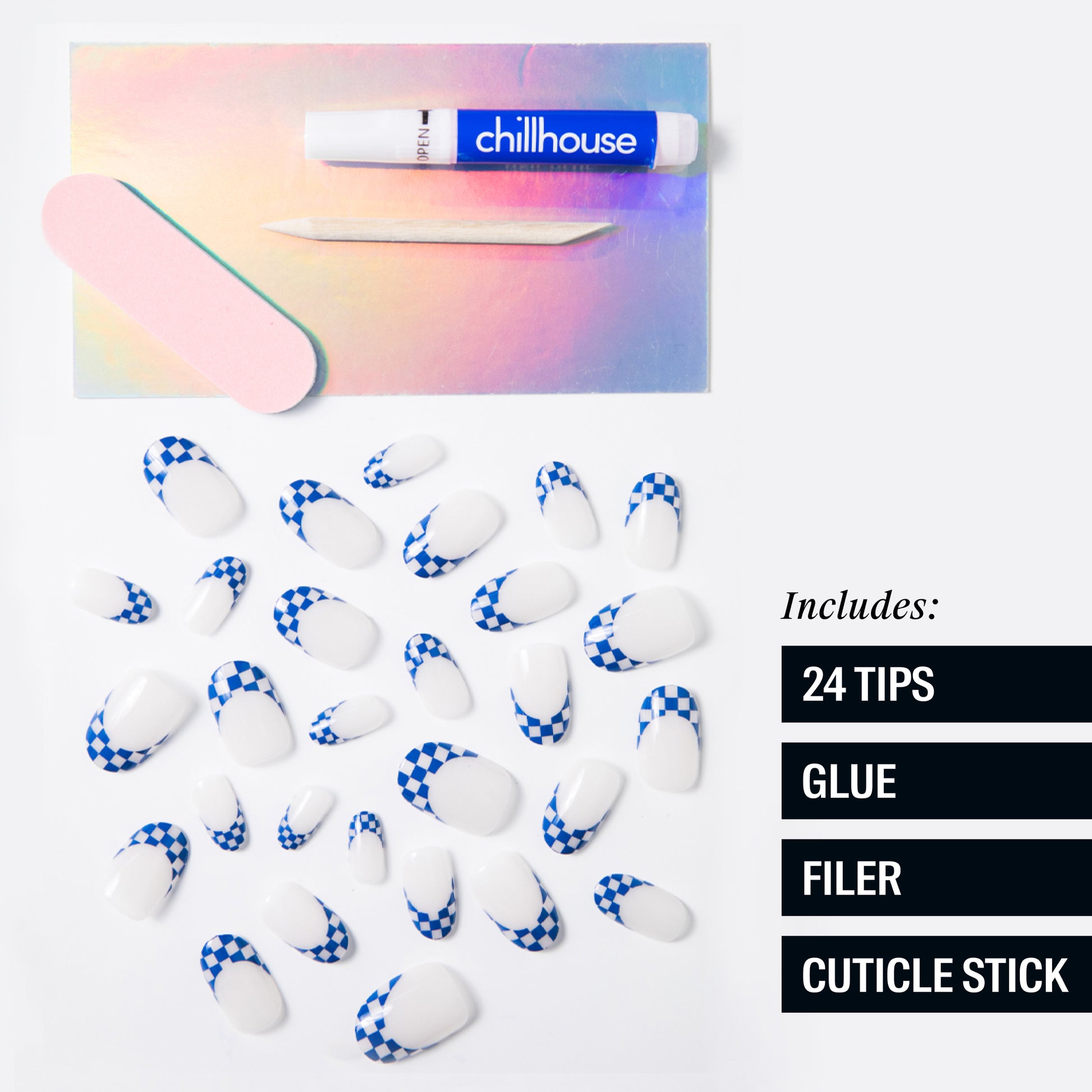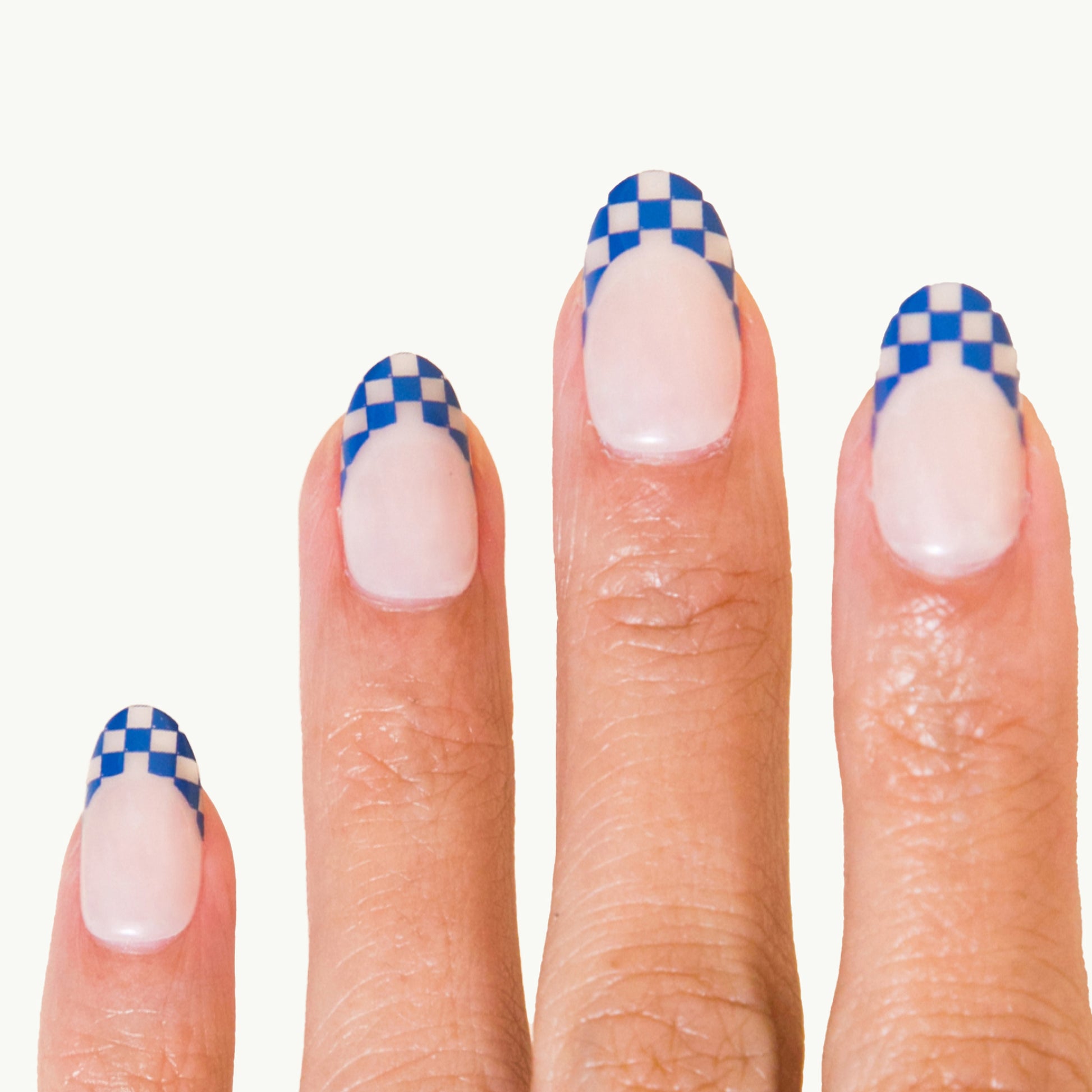 Our signature checkered print gets a moody blue makeover—statement tips your French mani can’t match.