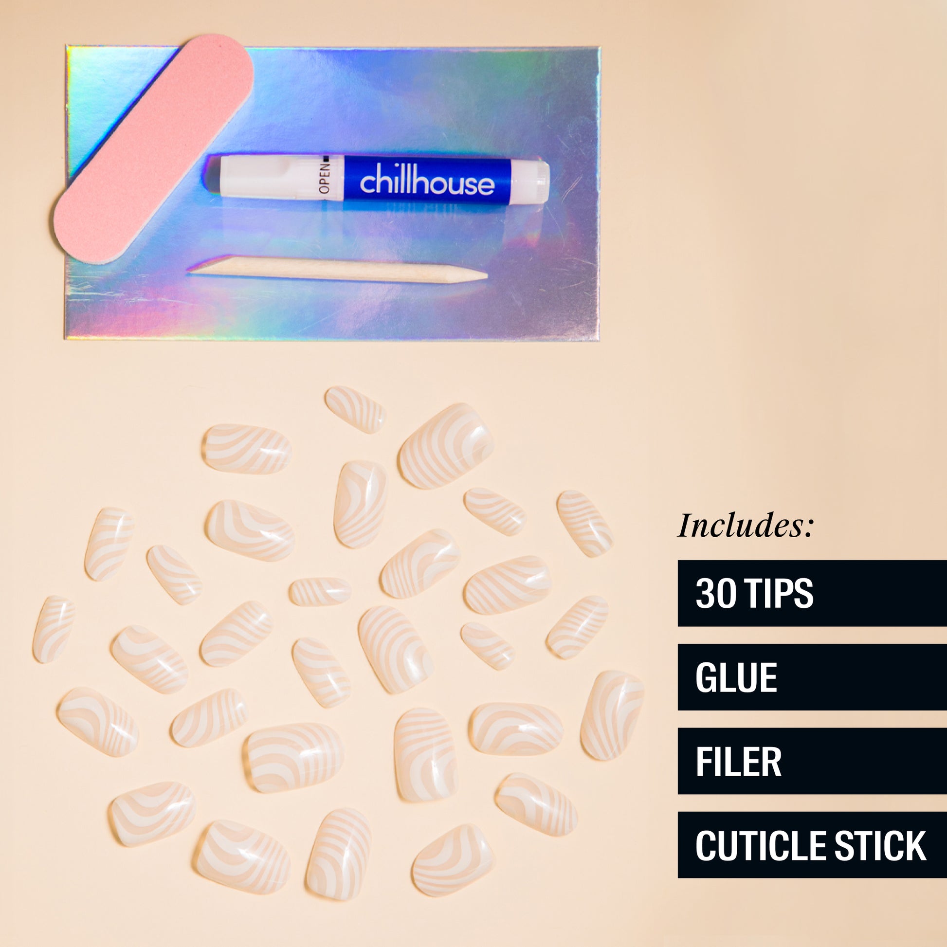 Application VideoTo apply Chill Tips press-on nails, start with clean, natural nails and prep by buffing and pushing back cuticles.