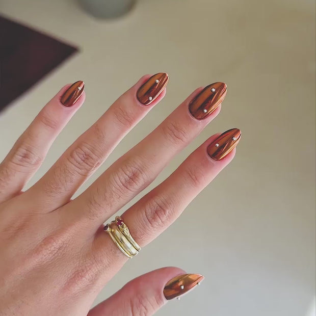 A bronzy, chocolate chrome laced with metallic embellishments. Bold, glossy, and unapologetically fashionably late.