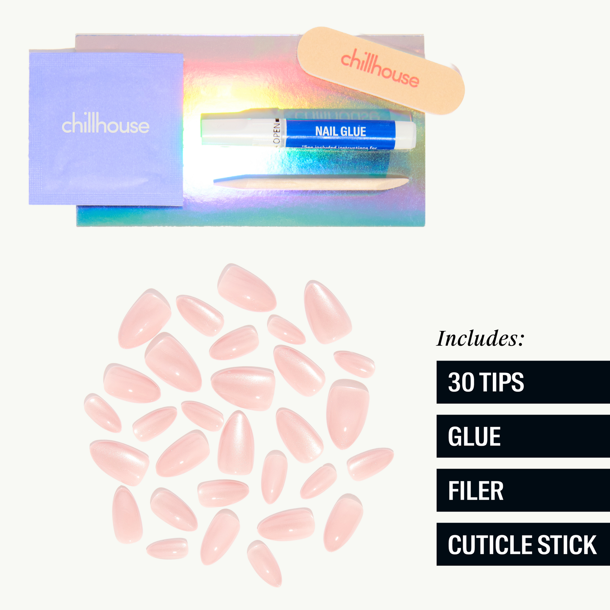 Application VideoTo apply Chill Tips press-on nails, start with clean, natural nails and prep by buffing and pushing back cuticles.
