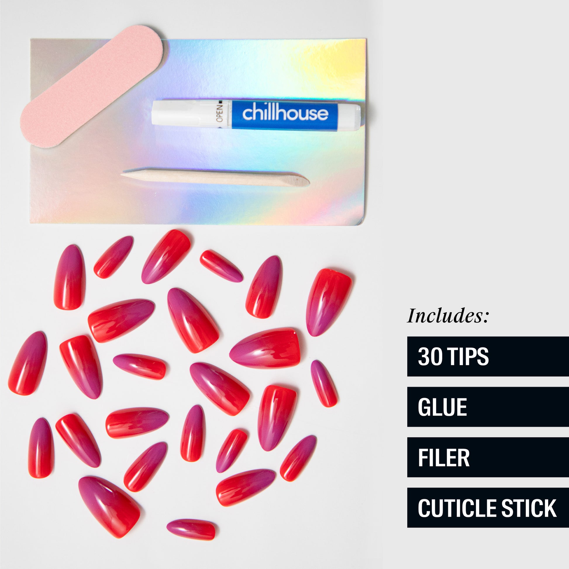 Application VideoTo apply Chill Tips press-on nails, start with clean, natural nails and prep by buffing and pushing back cuticles.