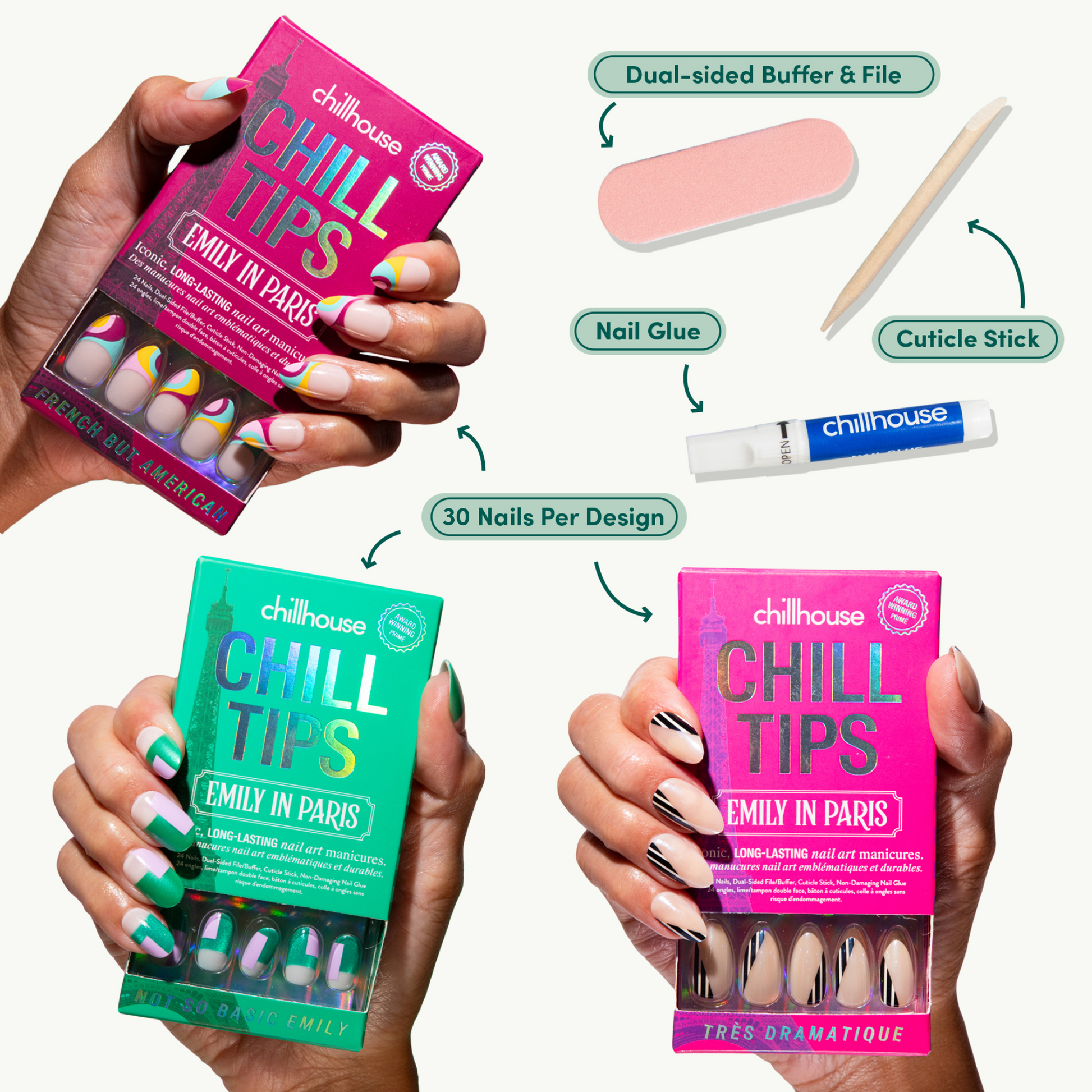 Never say “#OhCrepe!” over a chipped nail again. Meet the chicest collaboration of the season - the Chillhouse x Emily In Paris Collection. Express your inner parisian & enjoy life's little luxuries with this trio of Chill Tips that is oh-so-chic and effortlessly cool.  Oui, please!
