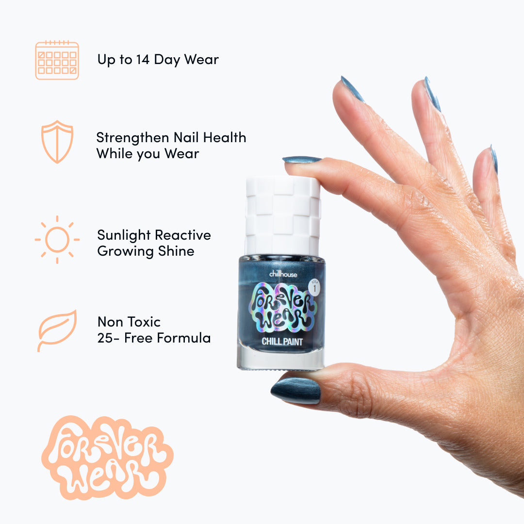 Forever Wear Chill Paint is reactive to our innovative Magic Finish Top Coat formula, curing your mani over time.