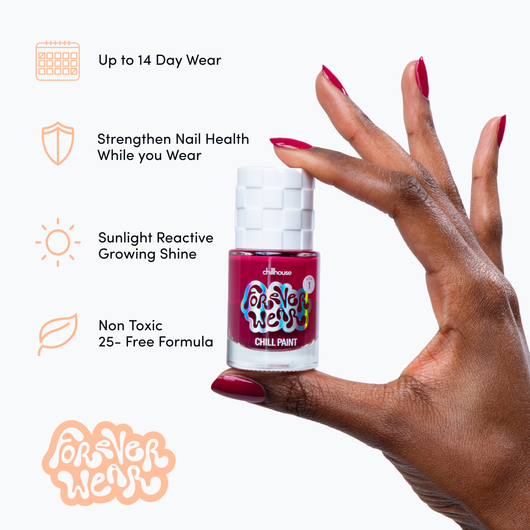 Forever Wear is a two-step, gel-like polish system that strengthens and brightens nails—no UV lamp needed. Pair Chill Paint with Magic Finish Top Coat for a plump, long-lasting mani that resists chips, peels, and scratches.