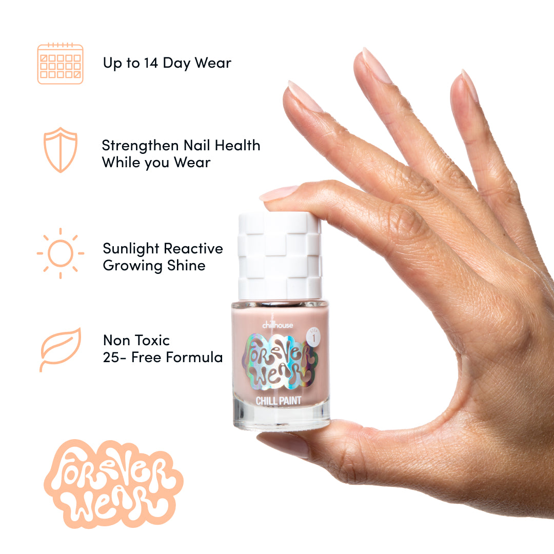 Forever Wear is a two-step, gel-like polish system that strengthens and brightens nails—no UV lamp needed. Pair Chill Paint with Magic Finish Top Coat for a plump, long-lasting mani that resists chips, peels, and scratches. I Can't Believe It's not Gel.