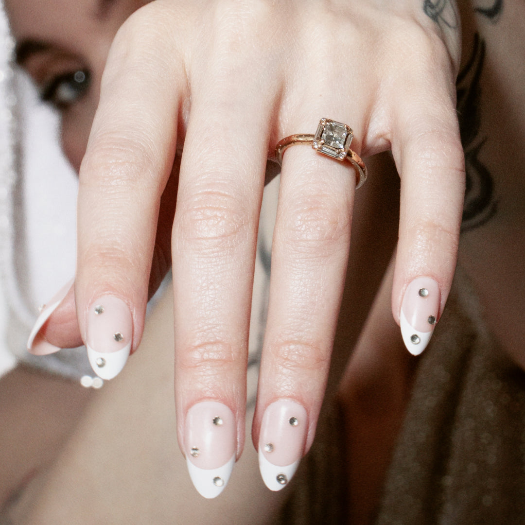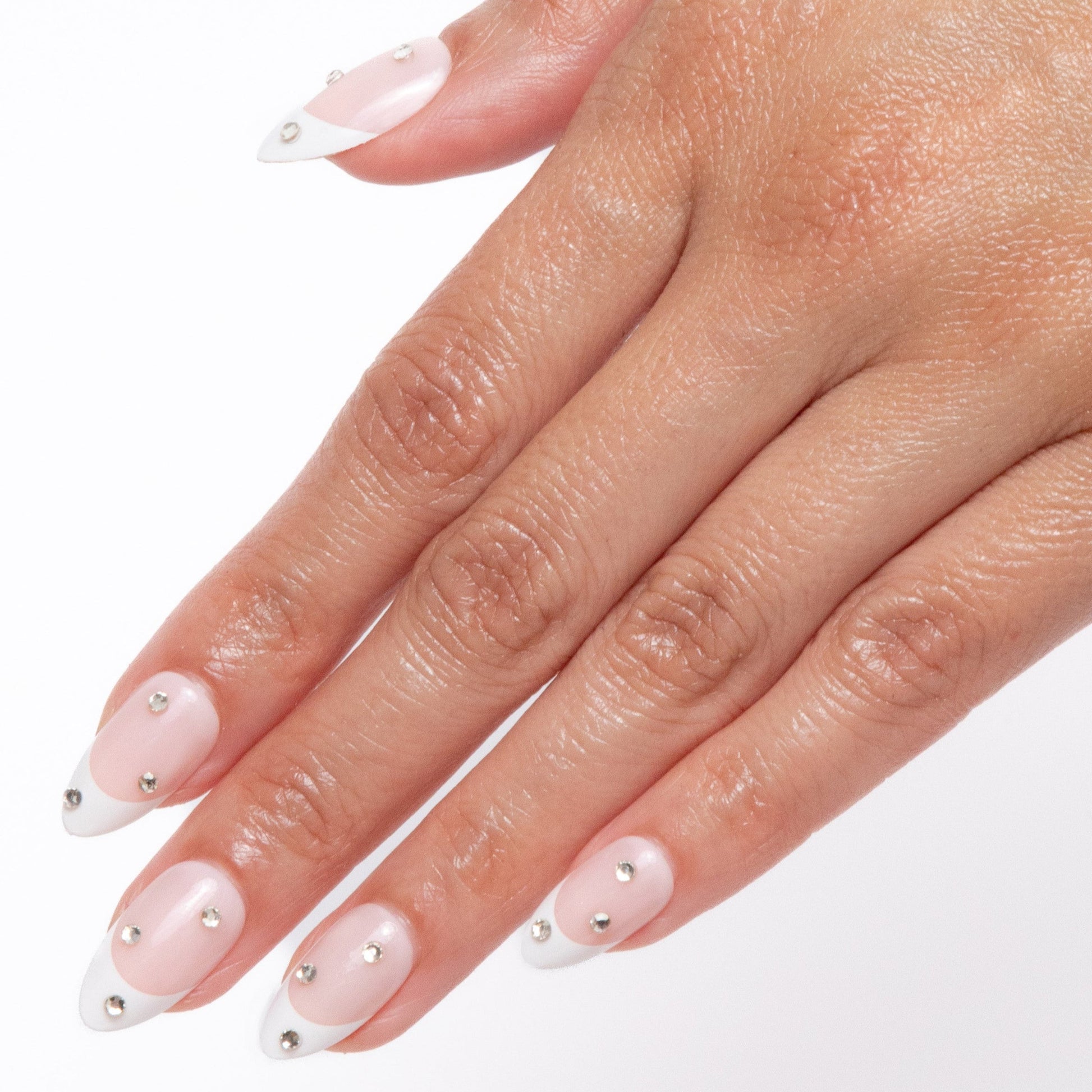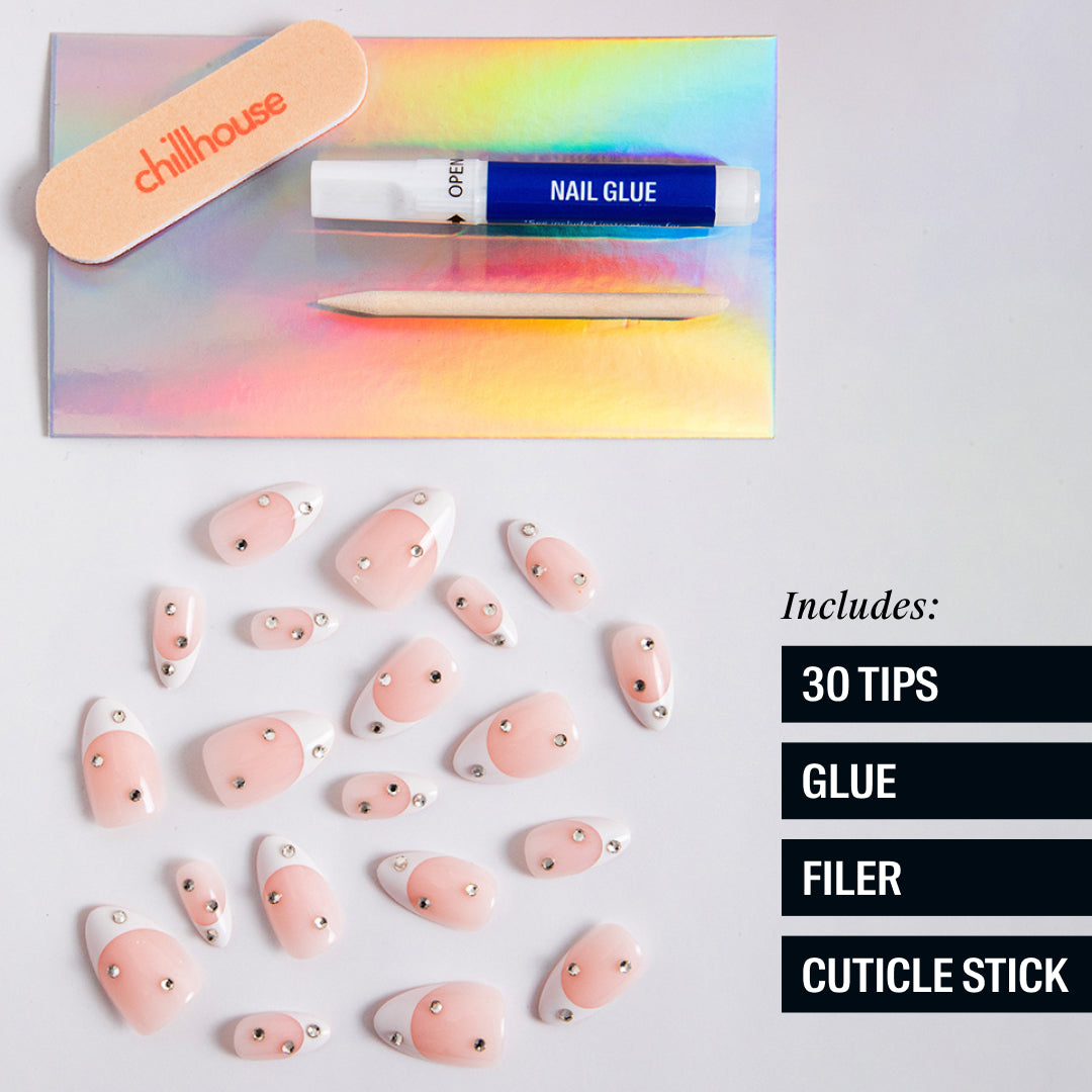 Sheer base, white tips & rhinestones bring bridal vibes with a chill twist.